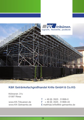 tribünen. logistik, festzelte, podeste K&K Getränkefachgroßhandel Krille GmbH & Co.KG Klötzerstr. 31c 01587 Riesa T + 49 (0) 3525 . 51899-0 www.KK-Tribuenen.de F + 49 (0) 3525 . 51899-40 www.KK-Getraenke.de E matthias.krille@kk-getraenke.de 28
